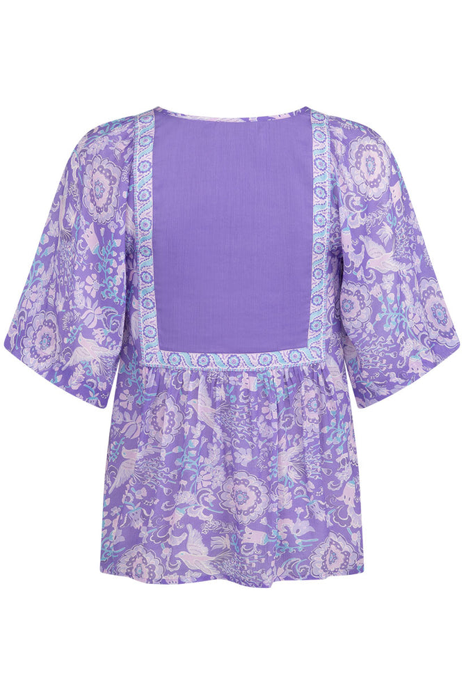 Embrace your playful side in the Sannah Short Sleeve Blouse. The allover print boasts a patchwork of signature patterns and intricate details. The front placket button opening and neck ties with tassel trim add a touch of whimsy. The lavender colourway matches back beautifully with our Siesta Pant.
